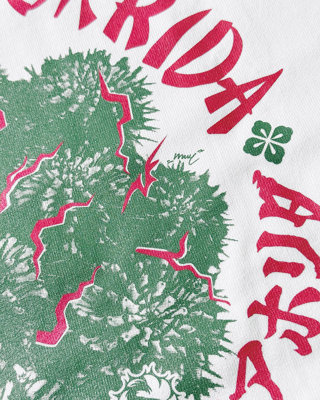 ホワイトカラーのTシャツに園芸を象徴する深緑と、赤のインクを使用。重厚感のある9.1ozのボディを使用。